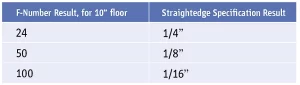 Appropriate floor flatness requirements for the slab, based on conditions, intended usage, and service requirements, can be found in ACI 302 section – Guide for Concrete Floor and Slab Construction. Although there is no exact method of comparing f-numbers to conventional straightedge testing results, the following chart can be used as a guideline to approximate values between the two: