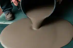 When mixing, it is critical to use the correct water-to-powder mixture. Mixing is done by adding the correct amount of powder to a premeasured amount of water. Once the powder is added to the water it is necessary to power mix with a heavy-duty drill at about 650 rpm for approximately two minutes. Power mixing will break the surface tension in the water, allowing for a smooth mix that will flow easily for about six to eight minutes. Once the mixing is complete, get the mix out of the container and onto the floor without delay. The approximate time from the time the powder hits the water to the stop of the flow time is about 10 minutes at room temperature, and you still need time for the spreading and smoothing process.