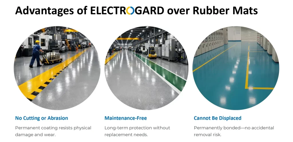 Rubber mats provide localized insulation only where they are placed. Dielectric floor coating protects the entire surface uniformly.