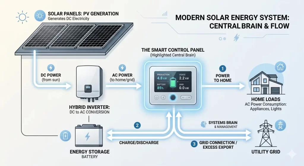 4. The control panel distributes electricity to loads or exports it to the grid.