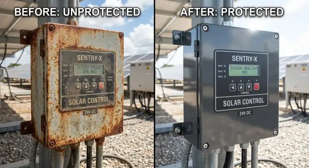 It protects sensitive components like inverters, BMS, and charge controllers from UV, moisture, and corrosion.